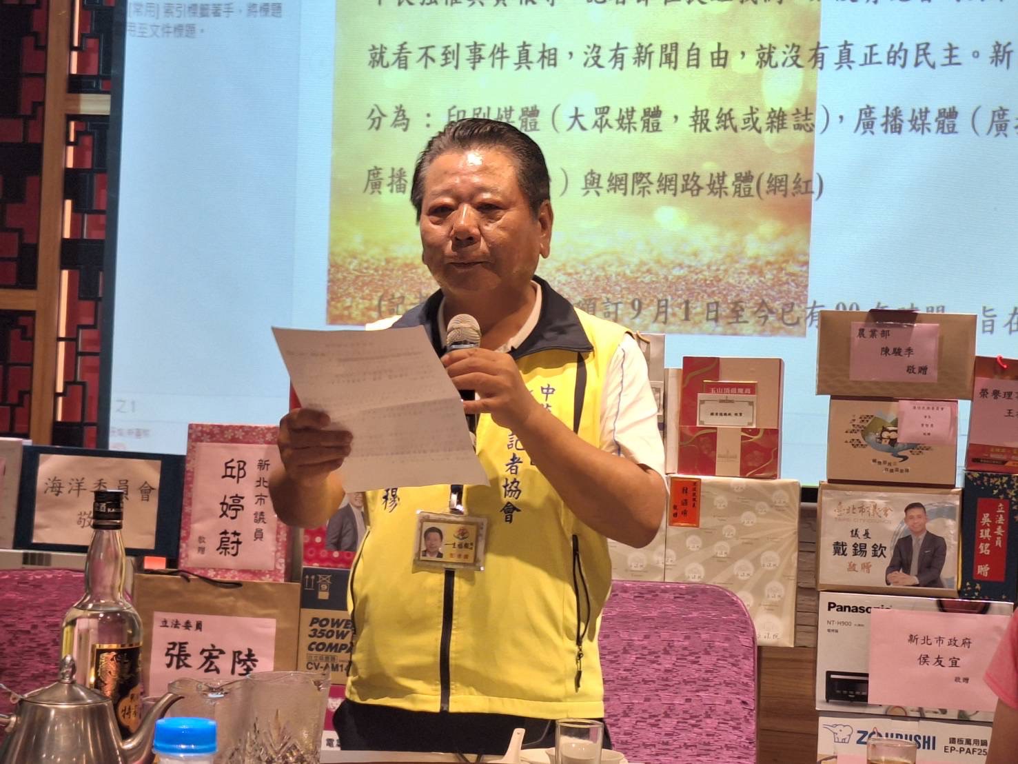 記者採訪 本會採訪報導 2024-08-31 中華民國新聞記者協會慶祝91記者節 慰勞記者辛勤付出 「同盟記者」林博洲 邱水文 王俊欽 陳玉柱 吳旻高 謝輝基 孫崇文 江雁武 侯嘉明 徐煒竣/聯合報導 中華民國新聞記者協會慶祝91記者節,體恤記者先進們平日辛勤付出,不畏強權真實報導。於113/08/31假狀元樓晶豪會館舉辦表揚有功記者暨會員聯誼餐會。 「記者節」自1934年頒訂至少已有90年歷史,旨在表彰記者爭取新聞自由的勇氣,其用意在提醒各國政府重視新聞自由,新聞媒體乃民主社會基石,國家進行根基,沒有記者的努力和堅持,就看不到事件真相,沒有新聞自由就沒有真正的民主。 徐璋穆理事長表示,新聞媒體分為:印刷媒體(大衆媒體、報紙、雜誌),廣播媒體(廣播電台、電視台),網際網路媒體(網紅)。媒體是社會公器肩負社會責任,提醒同業同仁 道德良知不可抹滅,社會公平正義必須存在,道德風範得以教育 傳承 永續,國家人民社會素養光明才能提升。 並感謝賴清德總統 蕭美琴副總統 立法院長韓國瑜 副院長江啓臣 行政院長卓榮泰 考試院長黃榮村 侯友宜市長 議長戴錫欽 蔣根煌 童子瑋 中央各部會 部長 會長 各區立委議員地方長官以及本協助同仁⋯⋯贊助摸彩品,同時感表彰同業同仁風雨無阻不屈不撓每天為國人 為社會真實報導,實現媒體的道德標準與社會責任。公益行善、造福人群報導 歡迎加入一生福報公益行善 https://lifebils.com/ 歡迎加入中華民國新聞記者協會 http://www.reporter.org.tw 返回
