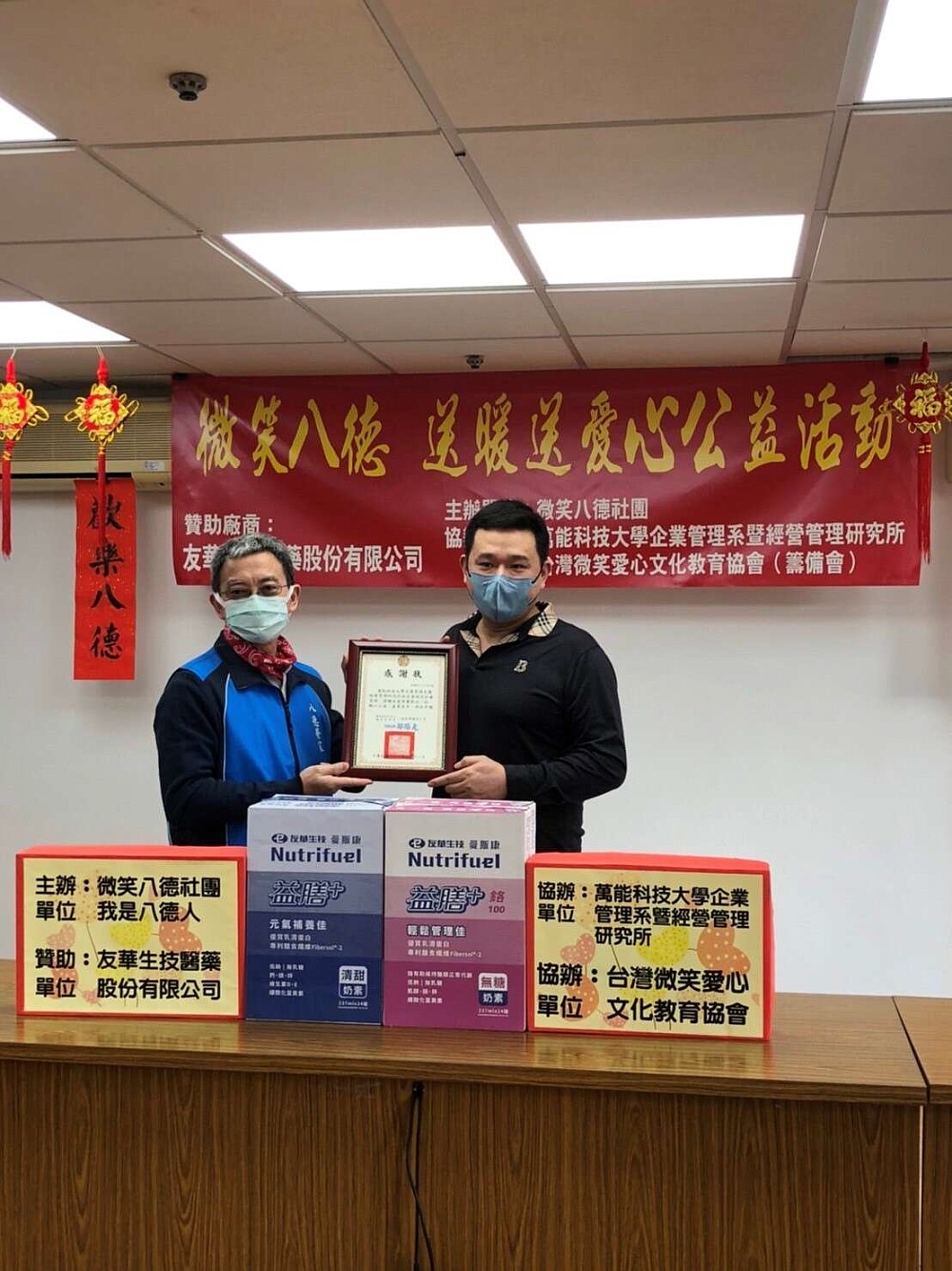 記者採訪 本會採訪報導 2022-02-11 【一生福報新聞】微笑八德在地社團傳愛 連結企業寒冬送暖送愛心 2022/02/11一生福報/記者林峻國/桃園八德採訪報導 虎年立春後的2月11日「微笑八德在地社團」結合友華生技醫藥股份有限公司,萬能科技大學企業管理系暨經營管理研究所及台灣微笑愛心文化教育協會等社團,捐贈八德榮家一百箱成人營養品–益膳,由代理主任鄭陽光及住民生活自治幹部張佑謙會長代為接受,感謝其對本家長輩關懷與照顧。 代理主任鄭陽光表示:榮家長輩平均年紀84歲,其中約有200人已至耄耊之年,隨著老化帶來牙口不良與衰弱問題,營養照顧對年邁長輩甚為重要,所以特別感謝萬能科技大學企業管理系暨經營管理研究所校友會理監事賴良賓、台灣微笑愛心文化教育協會籌備會會長古俊庭及微笑八德社團志工王鎔蓁等人熱心公益,送暖送愛心,對長者的照顧不遺餘力,八德榮家必將這份珍貴的資源分享與本家長輩,以增進其身體健康。 八德榮家過去致力提供榮民長輩安養及養護服務,近年更資源分享,開放一般民眾入住,協力推動「為老年人找依靠」,及「在地老化」之社福政策,歡迎社會各界共同努力,更加豐富住民生活內涵,期待藉此活動吸引更多人與我們一起投入陪伴及照顧長輩,讓高齡化的社會更美好。 公益行善、造福人群報導 歡迎加入一生福報公益行善 https://lifebilss.iarts.tw 歡迎加入中華民國新聞記者協會 https://ca.iarts.tw/ 返回